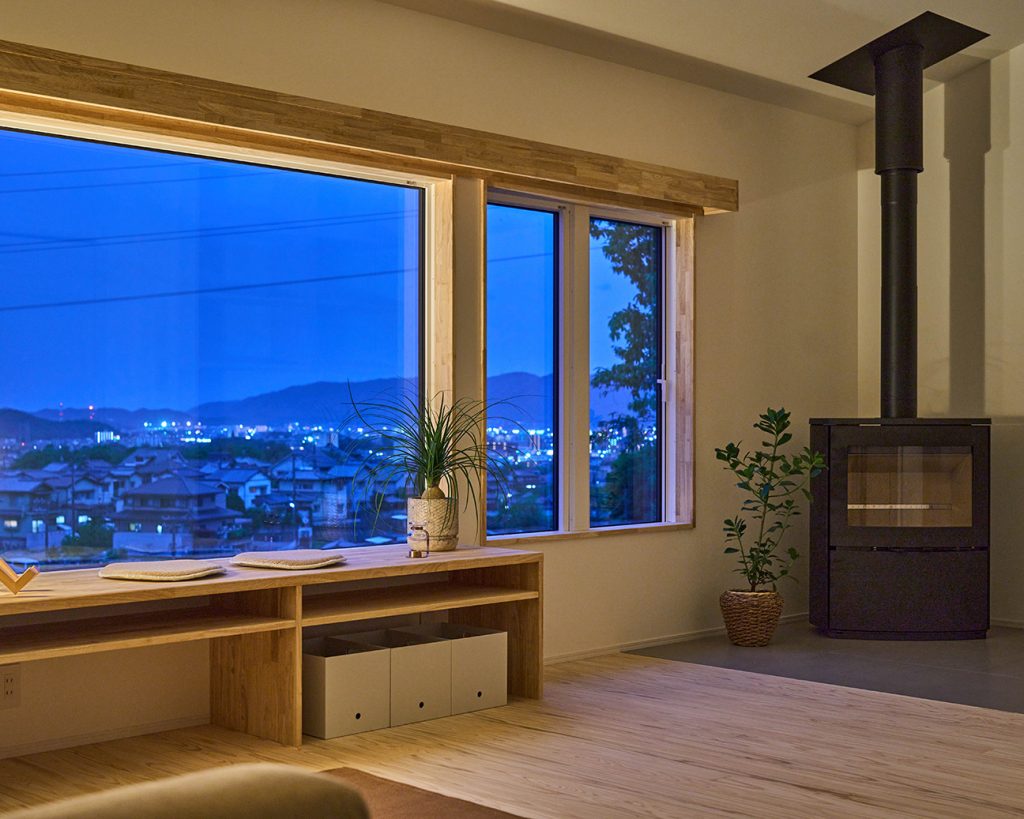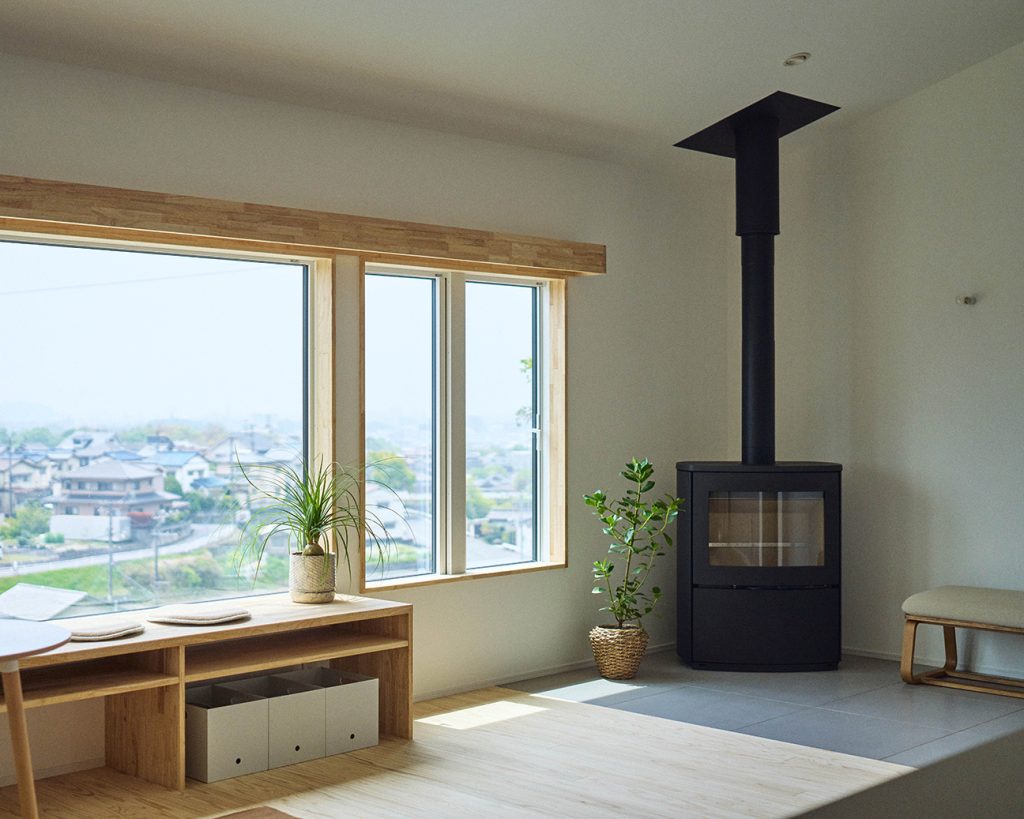 パノラマの景色を望む2階LDKに設えた薪ストーブ。